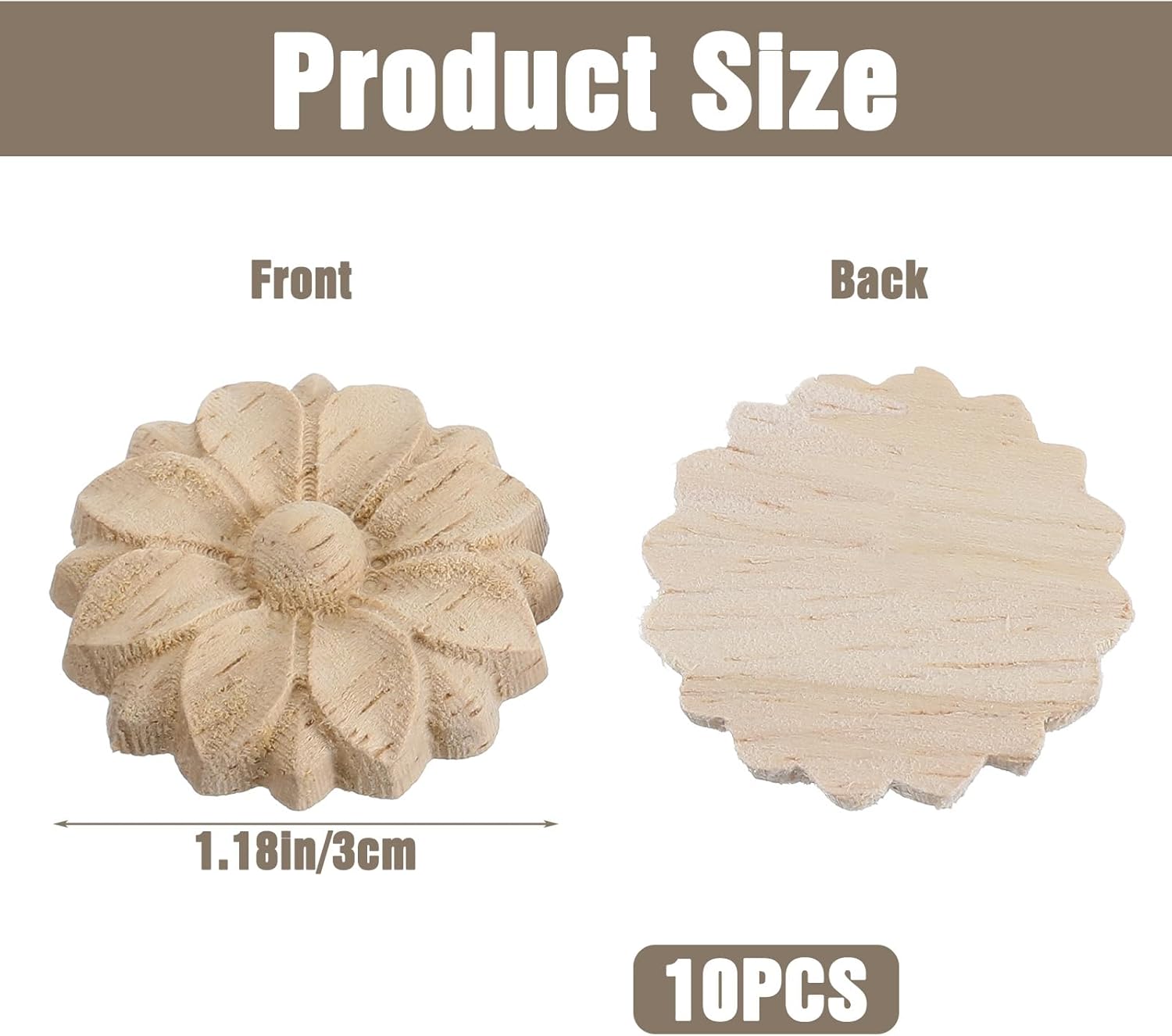 10PCS Wood Round Flower Appliques, Unpainted Wood Appliques Carved Craft Decals for Home Furniture Chests Cabinet Door DIY Decor, 3cm Diameter